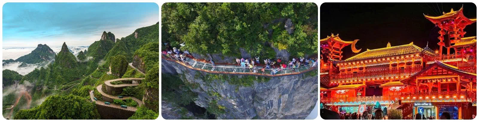 - Đại Hiệp Cốc (Cầu Pha Lê) - Cây cầu đáy kính nổi tiếng này rộng 6m, dài 430m, bắc qua 2 vách đá ở độ cao 300m được xem là cầu kính cao và dài nhất thế giới(Chi phí tự túc).